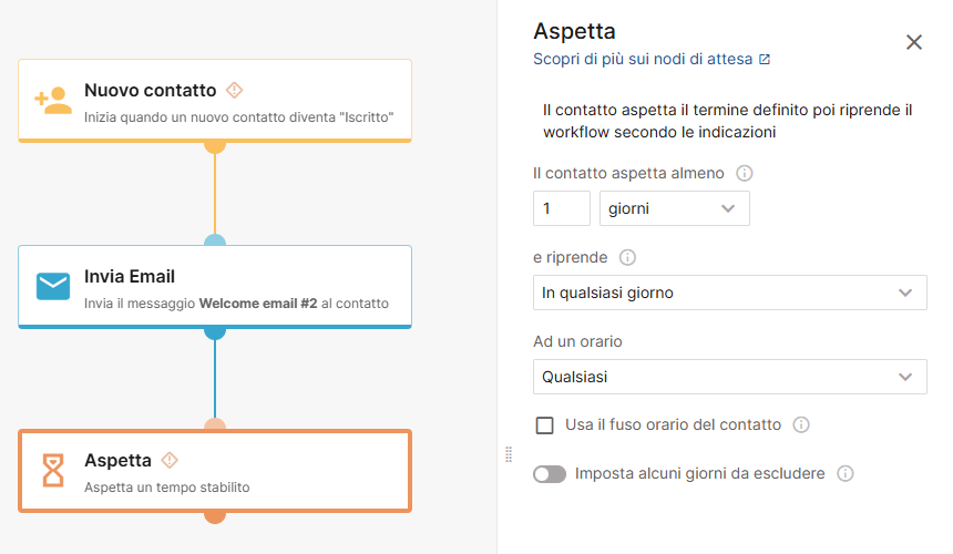 - I nodi di attesa trattengono i contatti in una determinata fase del workflow.