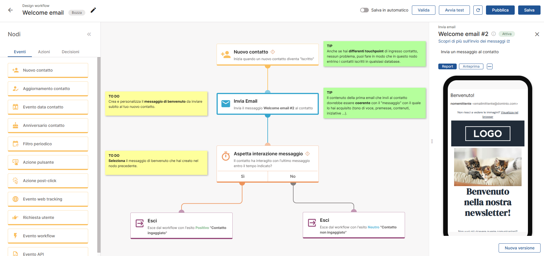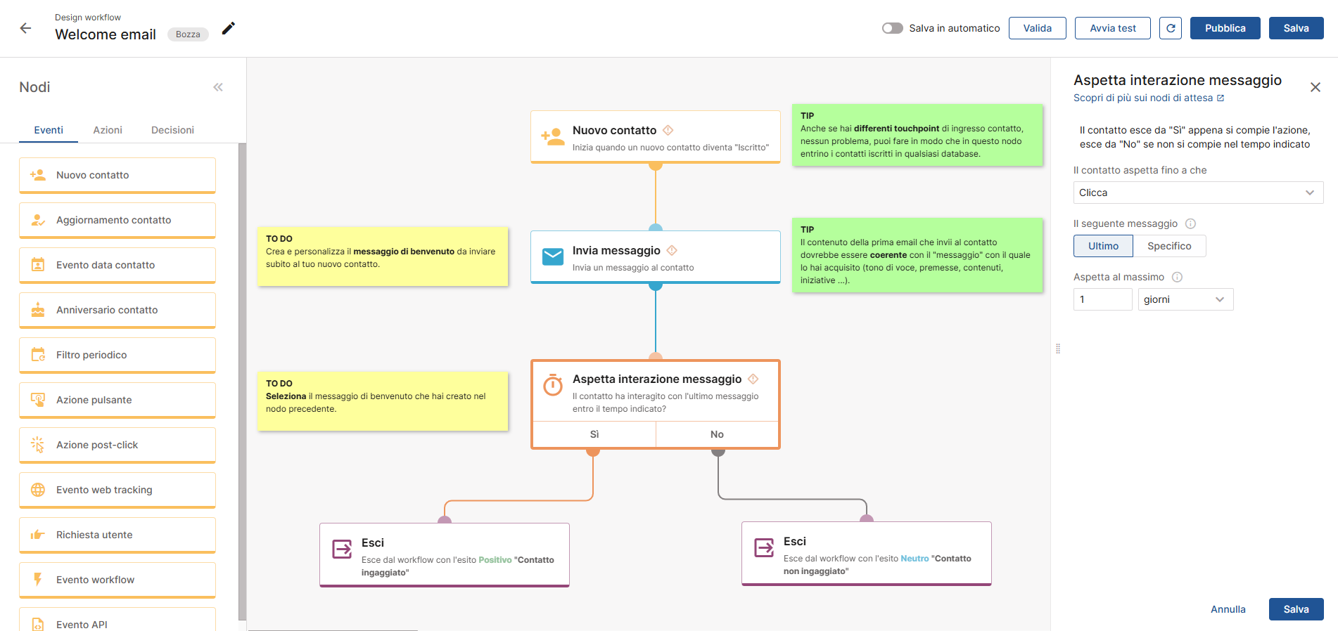 Ad esempio, se selezioni il nodo Attesa interazione messaggio, nella sidebar di destra vedrai una serie di opzioni, mentre se selezioni il nodo Invia messaggio, troverai l’anteprima del messaggio da spedire insieme alle relative impostazioni.