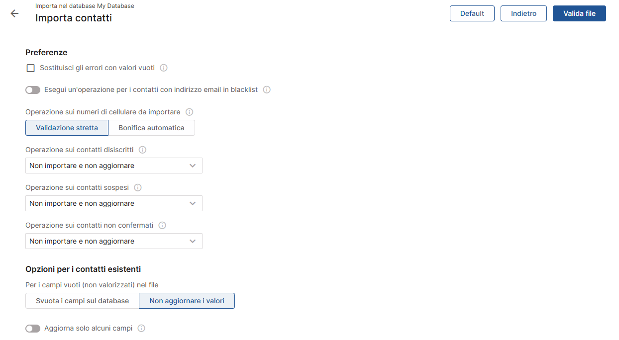 Inoltre, se avevi selezionato inizialmente di aggiornare i contatti già esistenti nel database, puoi decidere che operazione eseguire sui campi vuoti (non valorizzati) del file scegliendo tra "Svuota i campi sul database" e "Non aggiornare i valori".