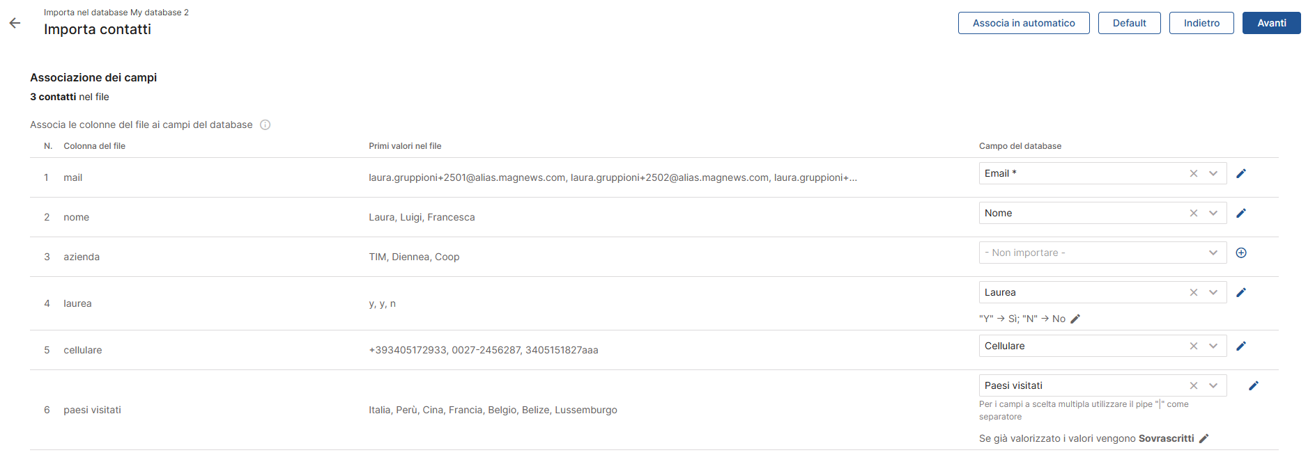 Puoi utilizzare l’associazione automatica, che prova a mappare i campi preconfigurati, oppure intervenire manualmente scegliendo per ogni colonna il campo di destinazione più adatto.