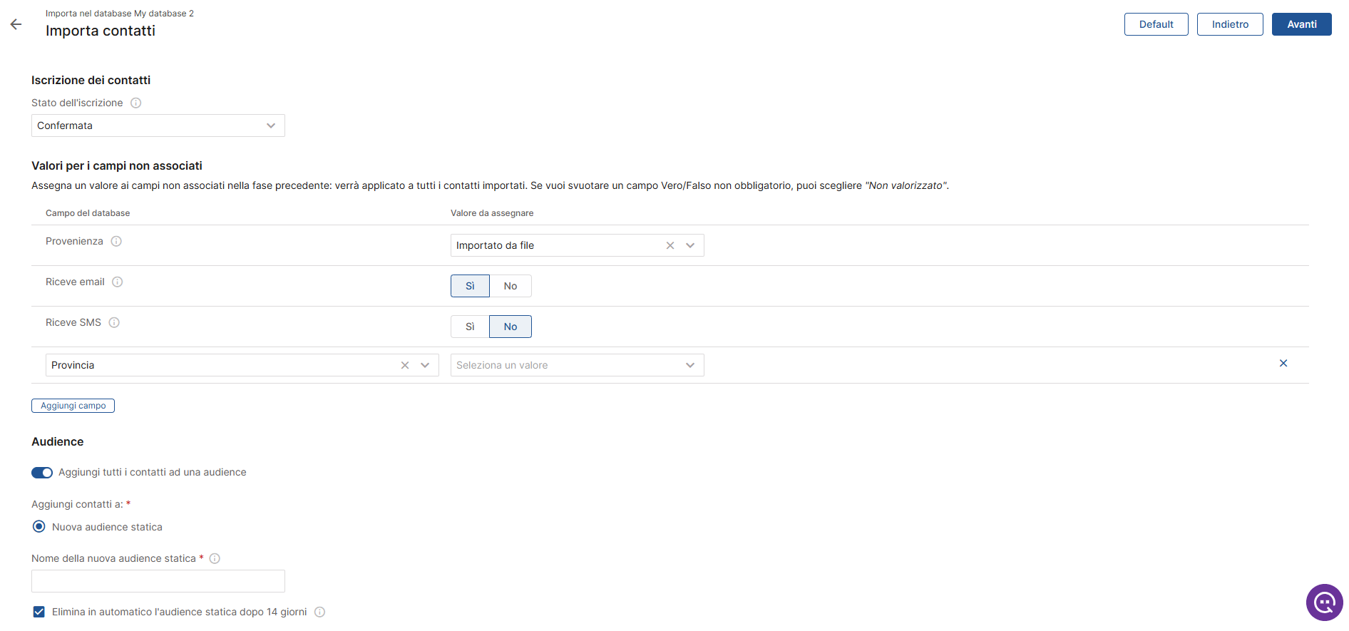 Inoltre, in questa fase puoi scegliere se aggiungere i contatti importati a una audience. Questa opzione ti aiuta a rintracciarli facilmente in magnews e a usarli per l’invio di comunicazioni mirate. Puoi creare una nuova audience statica (che di default sarà eliminata dopo 14 giorni) oppure utilizzare un’audience già esistente, mantenendo separata la gestione dei contatti da quella delle audience.