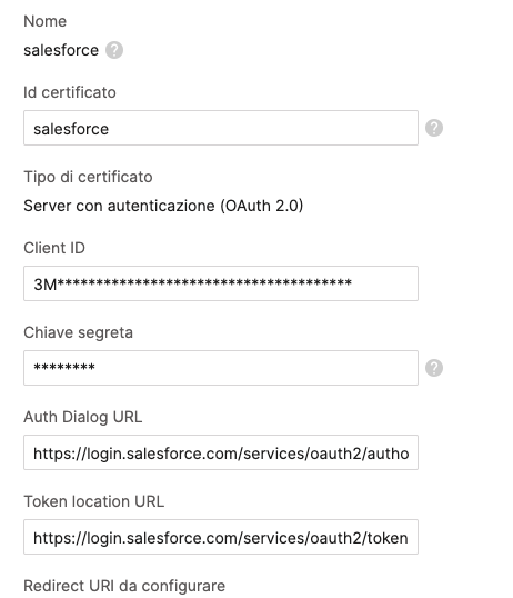 Dal menù Connect > Salesforce > Configurazione clicca su Impostazioni del certificato digitale Server e annota il valore indicato nel campo Redirect URI da configurare.