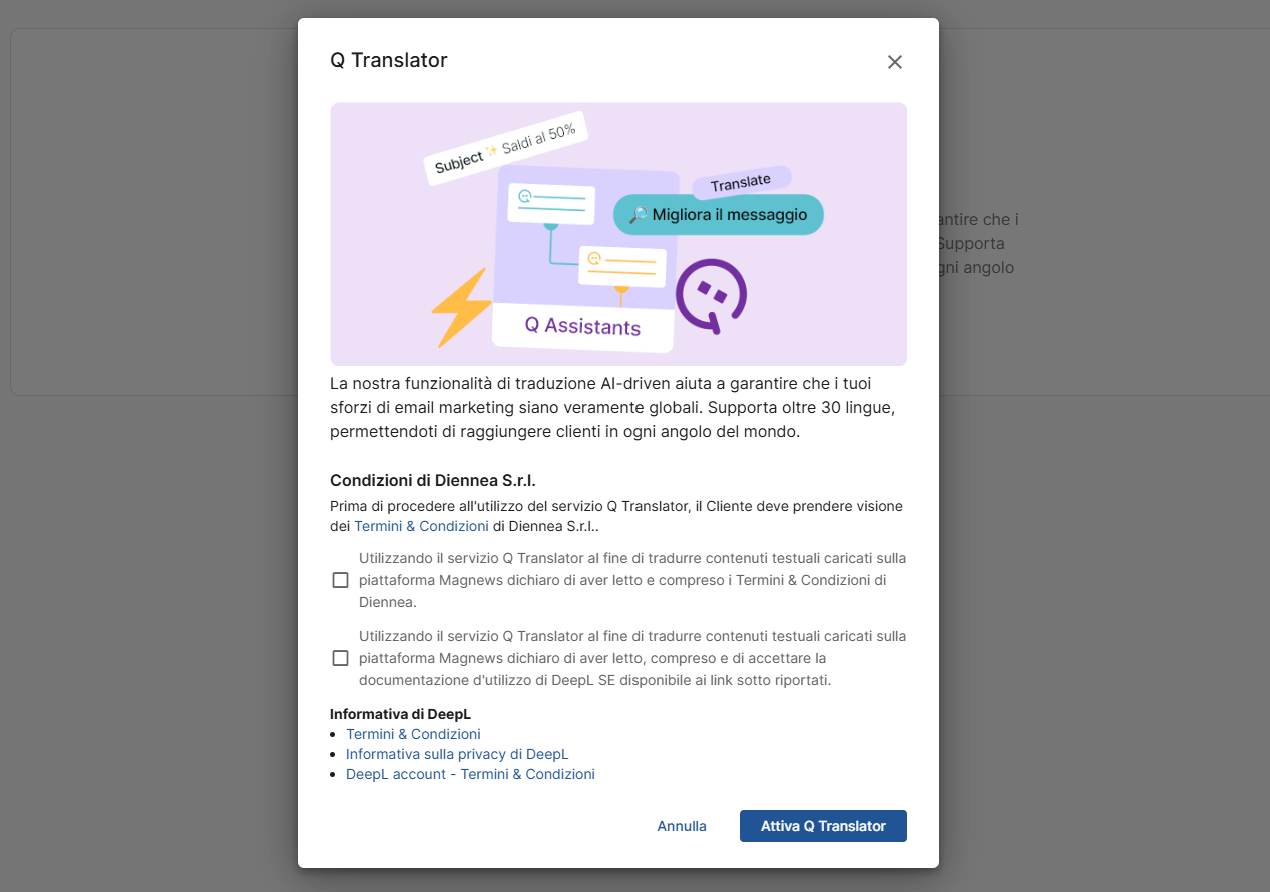 È possibile revocare l’accettazione dei termini e delle condizioni in qualsiasi momento. Accedi alla pagina Q Translator nella sezione "Connect", qui troverai visualizzate due card, cliccando sul pulsante "Termini e condizioni" nella card relativa, si aprirà una finestra dalla quale potrai revocare il consenso e, nel caso, riattivare di nuovo Q Translator.