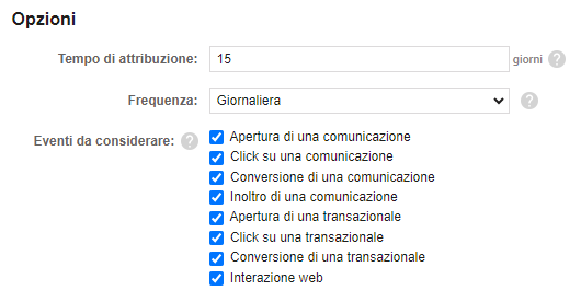 - Tempo di attribuzione: il numero di giorni entro cui le conversioni possono essere attribuite a un asset specifico (comunicazione, workflow, landing page ...).