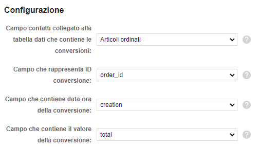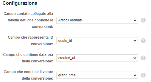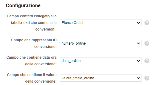 - Frequenza: quanto spesso verificare la presenza di nuove conversioni nella tabella dati (giornaliera o oraria).