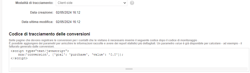 Seleziona la Modalità di tracciamento dell'obiettivo: Client-side o Server-side. Per saperne di più su quale modalità scegliere, puoi approfondire con questo articolo.