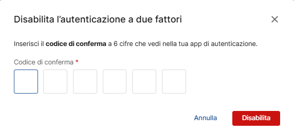 Per disattivare l'autenticazione a due fattori, clicca sul link Disabilita sempre dalla scheda utente; ti sarà richiesto di inserire il codice di conferma fornito dall'app