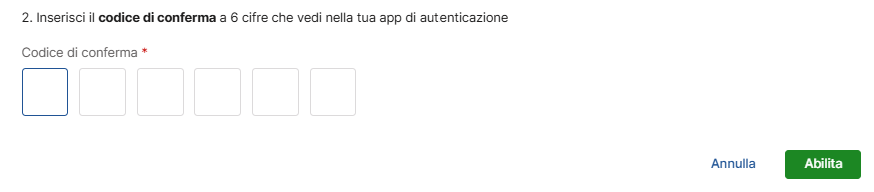 Inserisci poi il codice di 6 cifre che ti ha fornito la tua app e clicca su Abilita