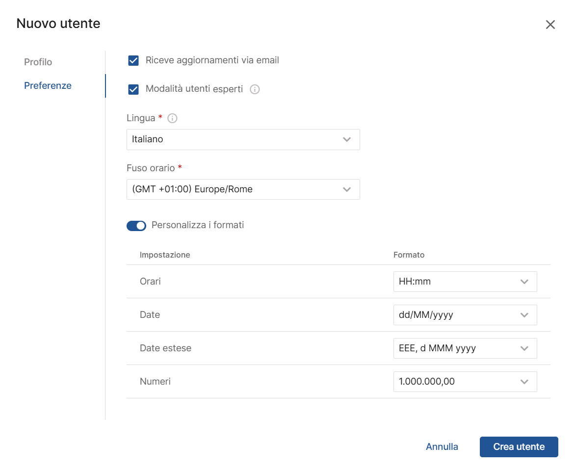 Modificando la lingua, i formati predefiniti (come orari e numeri), si adatteranno automaticamente alle tue scelte, hai comunque sempre la possibilità di personalizzare ulteriormente i formati predefiniti secondo le esigenze degli utenti del tuo team.