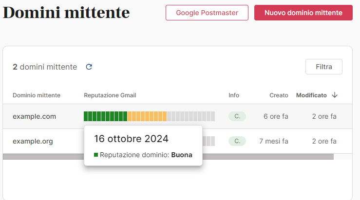 A questo punto nell'elenco dei domini mittente vedrai il dato sulla reputazione assegnata da Gmail.