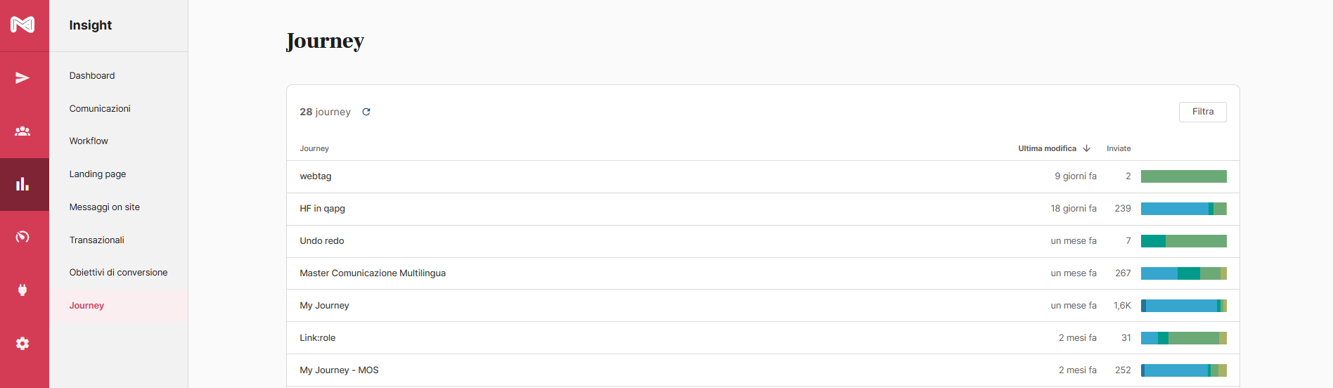 Accedendo alla scheda “Journey”, dalla sezione "Insight", trovi l’elenco dei journey. Per ogni journey sono visibili il nome, la data dell’ultima modifica, il numero di messaggi inviati e le principali metriche di performance.