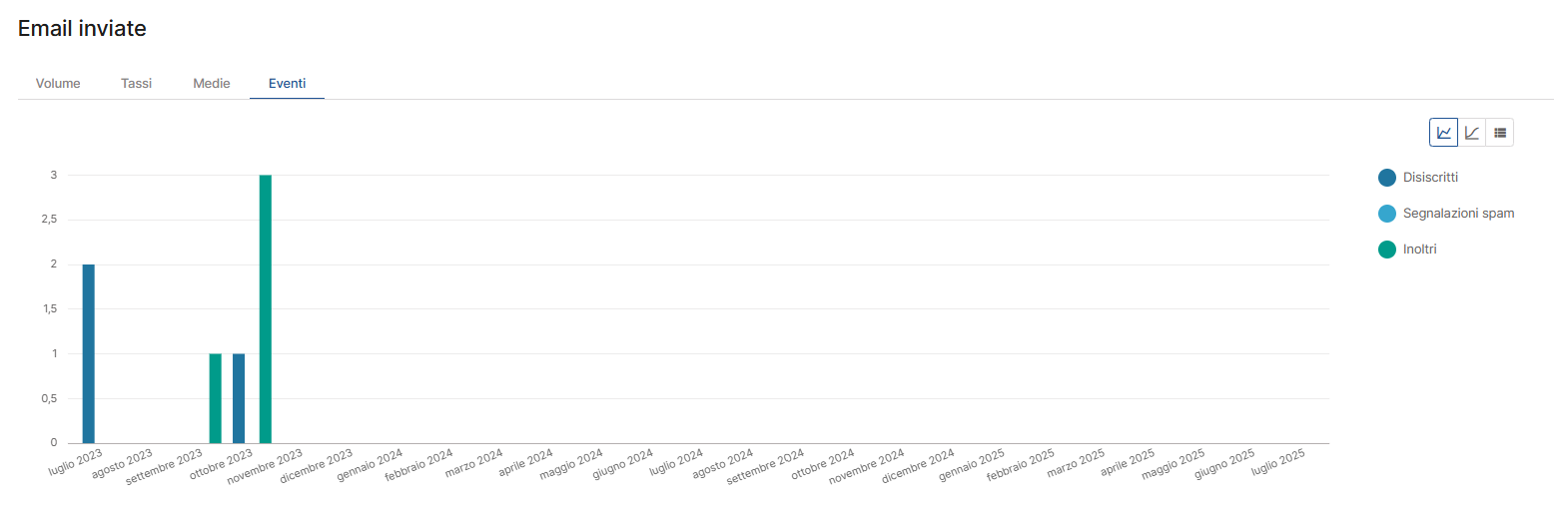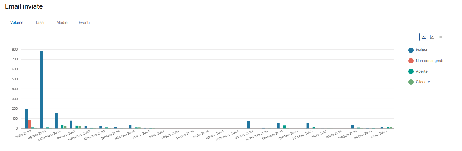 Volume: qui visualizzi mese per mese il numero di email effettivamente inviate, non consegnate, aperte e cliccate. Il grafico consente di attivare o disattivare ciascuna metrica per un’analisi mirata, rendendo più semplice individuare momenti di picco o flessione.