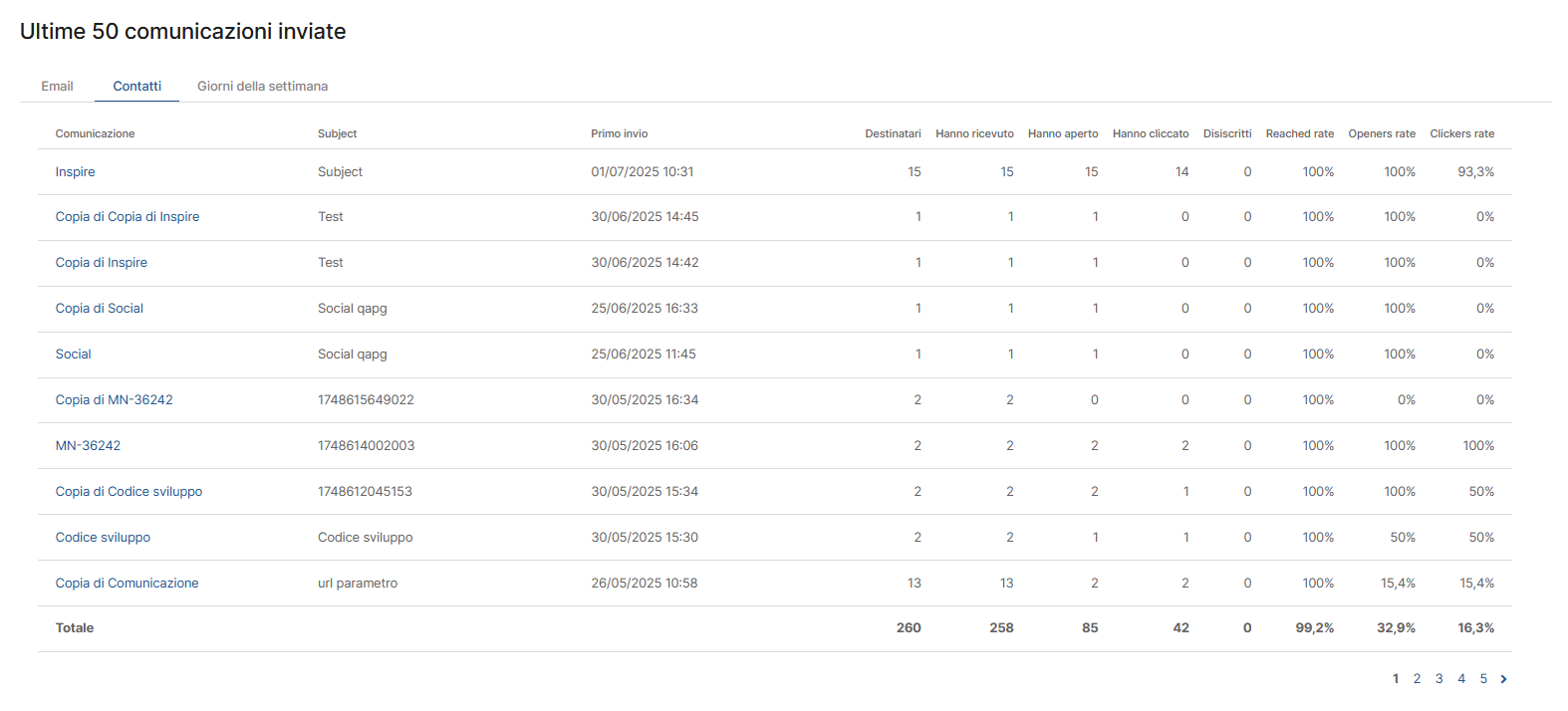 Grazie alla visualizzazione compatta e interattiva, puoi accedere con un click al report dettagliato di ciascuna comunicazione, per confrontare rapidamente le prestazioni dei singoli messaggi.