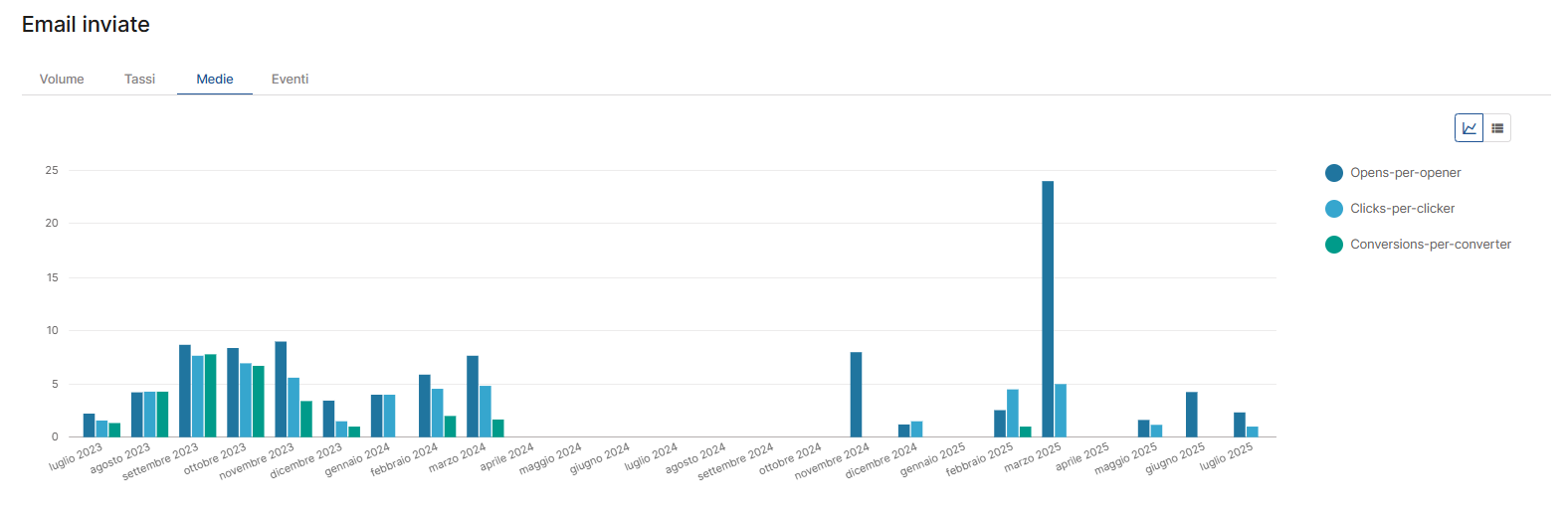 - Medie: qui trovi valori aggregati come Opens-per-opener, Clicks-per-clicker e Conversions-per-converter, che restituiscono una media mensile del livello di coinvolgimento reale degli utenti. Queste metriche sono particolarmente utili per misurare l’intensità dell’interazione: valori alti indicano un contenuto coinvolgente, mentre numeri bassi possono suggerire contenuti poco rilevanti. È un punto di vista qualitativo sul comportamento dell’utente, che affianca l’analisi quantitativa dei volumi.