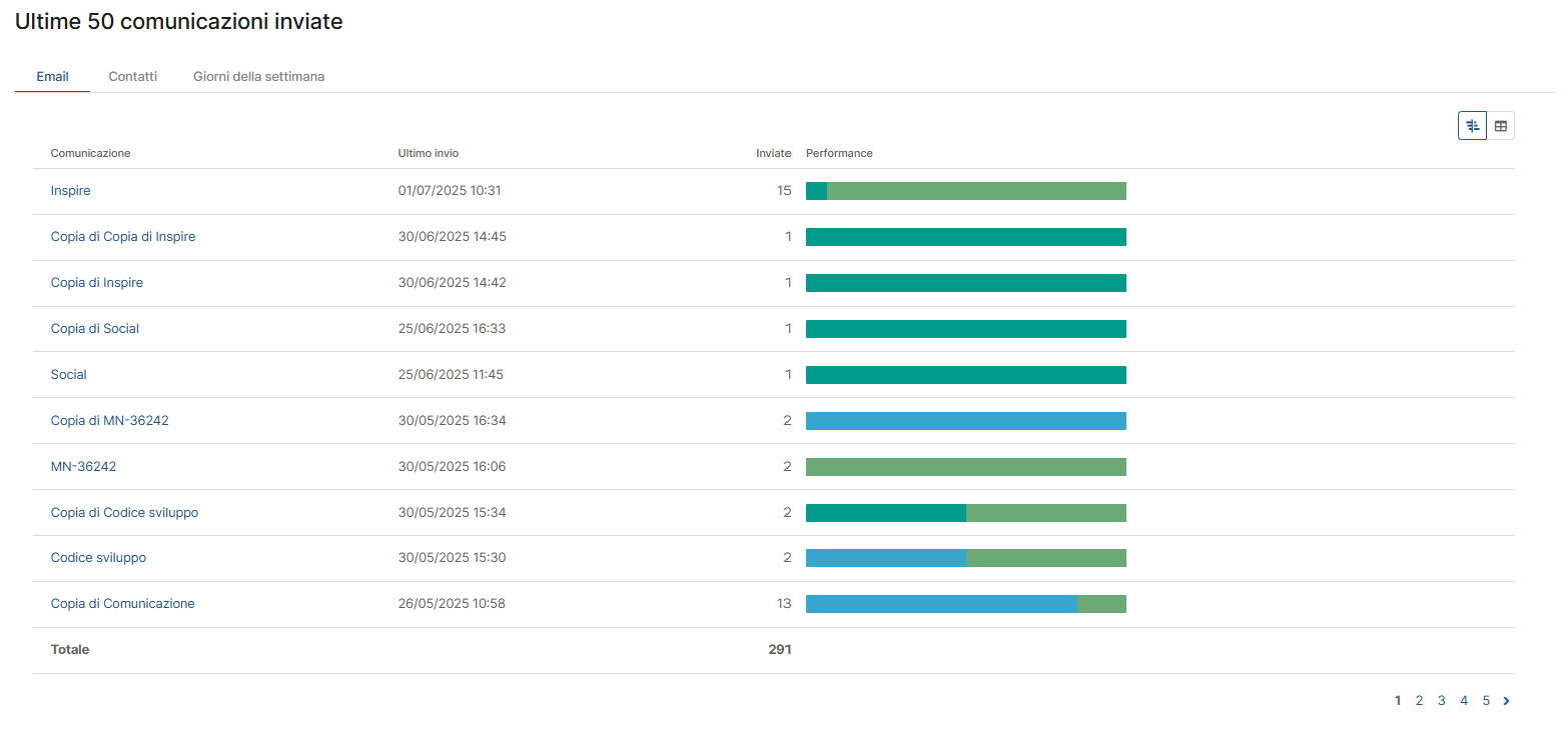 Email: in questa vista osservi l’elenco cronologico delle ultime comunicazioni inviate, con informazioni essenziali come Data e ora di invio, Numero totale di email inviate e Performance.