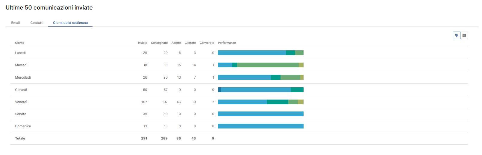 Giorni della settimana: qui puoi vedere la distribuzione aggregata delle performance in base al giorno di invio, numero di email inviate, consegnate, aperte, cliccate e convertite per ciascun giorno e una rappresentazione visiva a barre delle performance, utile per confronti immediati