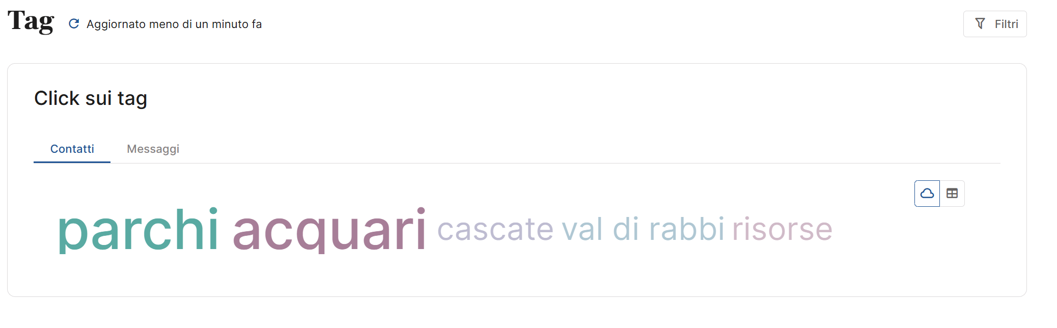 Cloud: nella vista predefinita – detta “a nuvola” – i tag cliccati vengono rappresentati visivamente in proporzione al numero di interazioni. Più un tag è stato cliccato, più è grande. Questa modalità ti permette di cogliere in modo immediato quali elementi hanno attirato maggiormente l’attenzione del tuo pubblico.