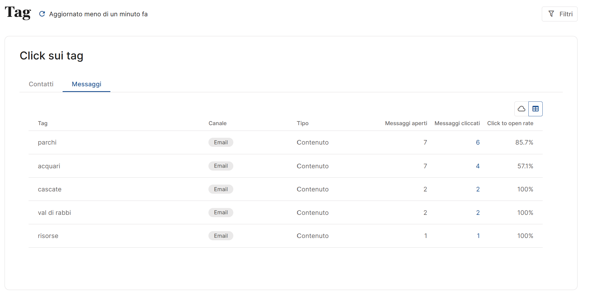 Valori: se vuoi andare oltre l’impatto visivo e avere una lettura analitica, puoi passare alla vista in tabella. Qui trovi tutti i tag cliccati, organizzati in righe che ne specificano il canale (es. email), il tipo (es. contenuto), e soprattutto i dati di performance, quanti utenti hanno aperto il messaggio che conteneva quel tag, quanti hanno cliccato effettivamente sul tag, il click-to-open rate, ovvero il rapporto tra click e aperture, la data dell’ultima interazione.