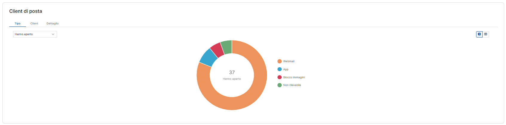 Nella vista a "Distribuzione", vedi una rappresentazione grafica a torta (donut), che mostra la proporzione delle aperture o dei click per client, aiutandoti a capire quali strumenti sono più diffusi tra i tuoi contatti.