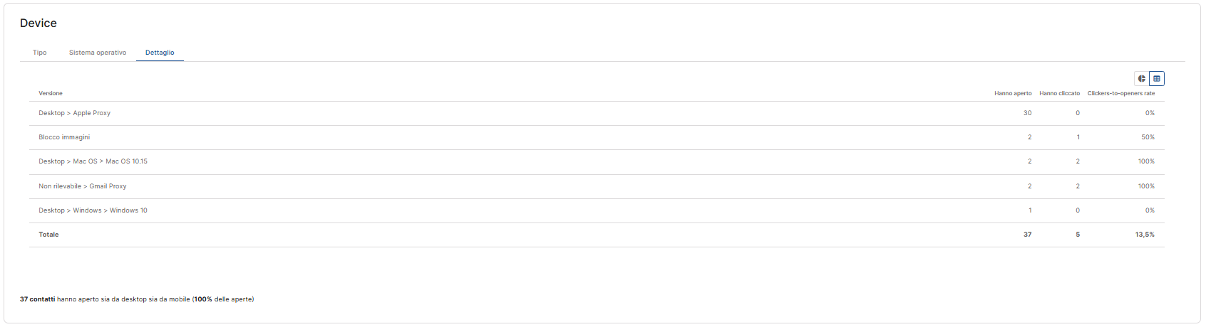 Device: sotto al report "Client di posta", trovi anche il report per tipologia di dispositivo (Device), (es. Desktop, Mobile) e sistema operativo (es. Mac OS, Windows, iOS, Android). Anche in questo caso, la visualizzazione può essere scelta tra quella sottoforma di torta o tabella.