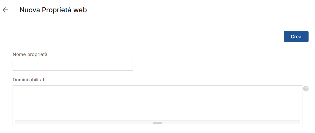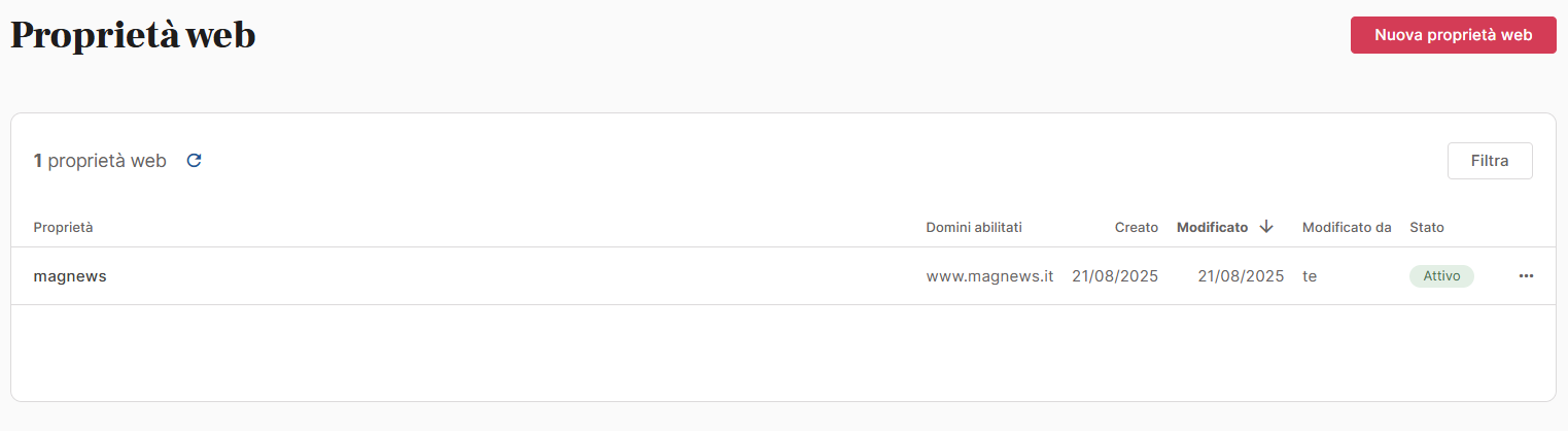 Per aggiungere una nuova Proprietà web clicca sul pulsante Nuova proprietà web in alto a destra.