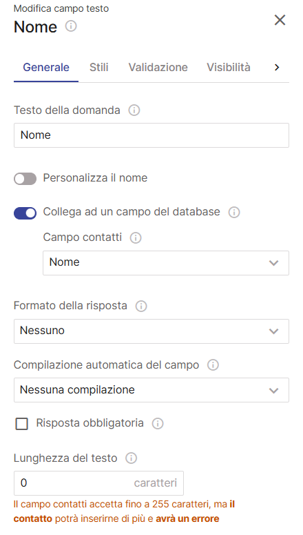 scegli il campo contatti del database in cui saranno registrati i valori inseriti in questo campo;