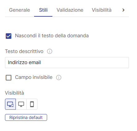 Usa questa opzione per nascondere il campo se viene compilato automaticamente, ad esempio da un link personalizzato o da uno script nella pagina. - Visibilità