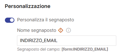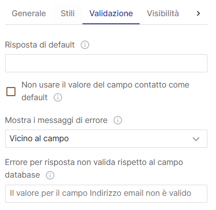 messaggio che sarà mostrato in casi di compilazione errata. Se selezioni il valoreDefaultverrà mostrato il seguente messaggio: "Il valore per il campo [nome_campo] non è valido." Se scegli il valorePersonalizzatoti sarà richiesto di personalizzare il testo del messaggio.