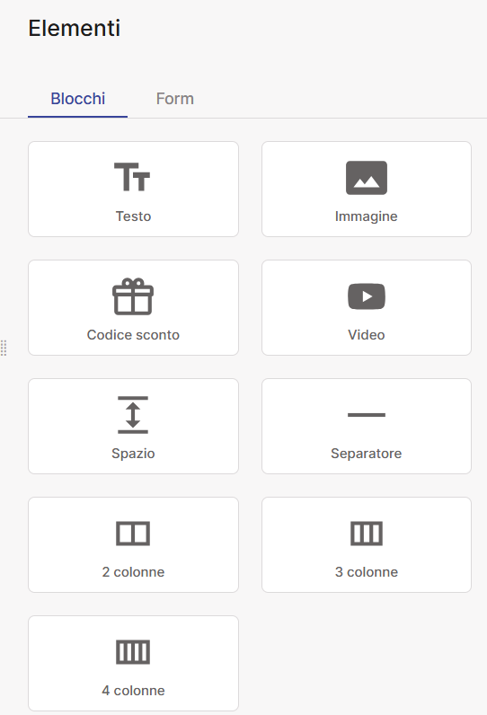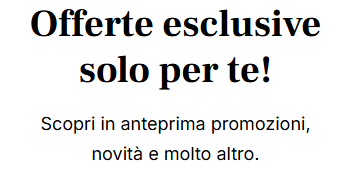 | Codice sconto | Aggiunge un elemento codice sconto. Il testo inserito al suo interno può essere direttamente copiato dall'utente che lo visualizza. | |