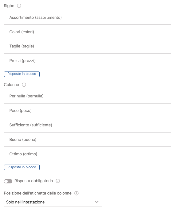 se l'opzione è attiva, l'utente potrà dare una sola risposta per colonna; -