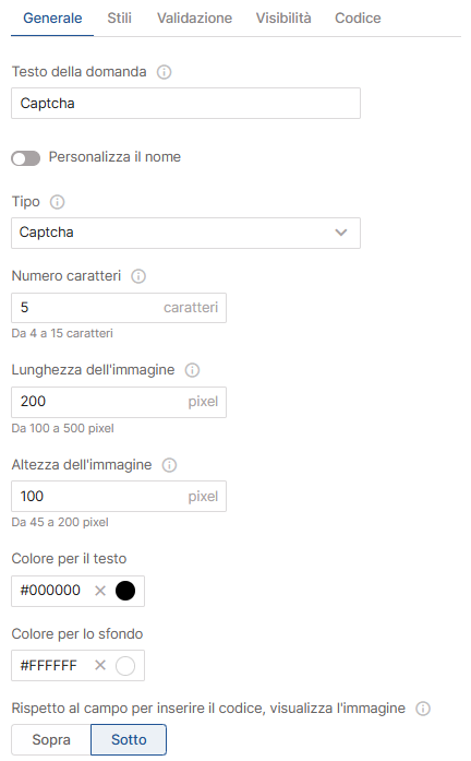 Per verificare che la compilazione non sia stata effettuata da un sistema automatico, il visitatore deve inserire il codice mostrato nell'immagine. Dovrai configurare: