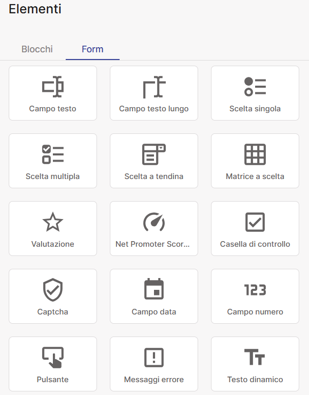 | Net Promoter Score | Aggiunge un elemento di tipo NPS che permette di raccogliere un punteggio da 0 a 10 per ogni domanda. | |
