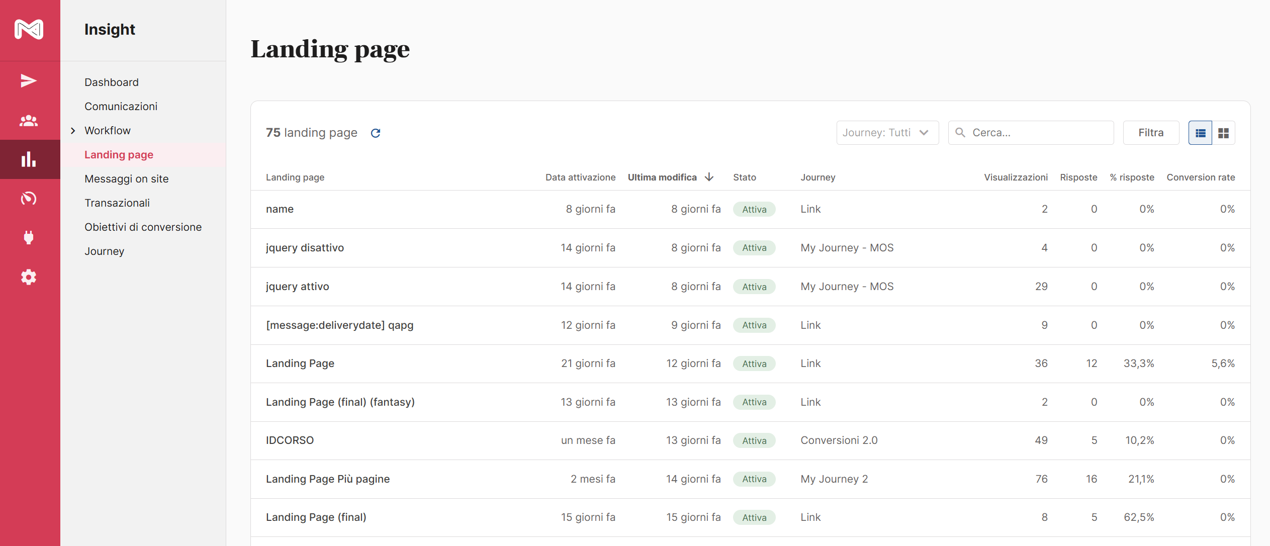 Accedendo alla sezione Insight > Landing page, trovi l’elenco di tutte le landing page, con i relativi indicatori di performance.