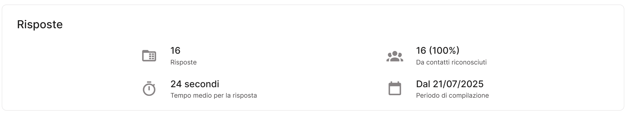 Il report dedicato alle risposte mostra quante risposte sono state raccolte, la percentuale proveniente da contatti già riconosciuti, il tempo medio di compilazione e l’intervallo temporale in cui sono arrivate. Questi indicatori ti aiutano a capire se la pagina è semplice da compilare e quanto è efficace nel coinvolgere sia utenti nuovi che già presenti nel database.