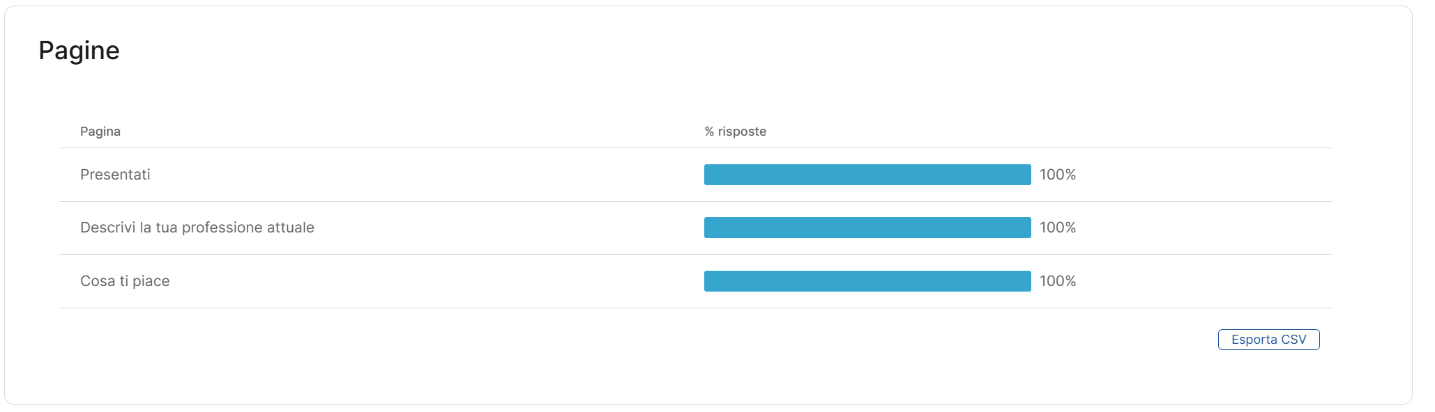 Se la landing page è composta da più pagine, viene mostrato anche il report Pagine, che evidenzia la percentuale di compilazione per ciascuna sezione. In questo modo puoi individuare i punti in cui gli utenti proseguono senza difficoltà e quelli in cui tendono ad abbandonare. È uno strumento prezioso per valutare il livello di engagement lungo tutta la sequenza.