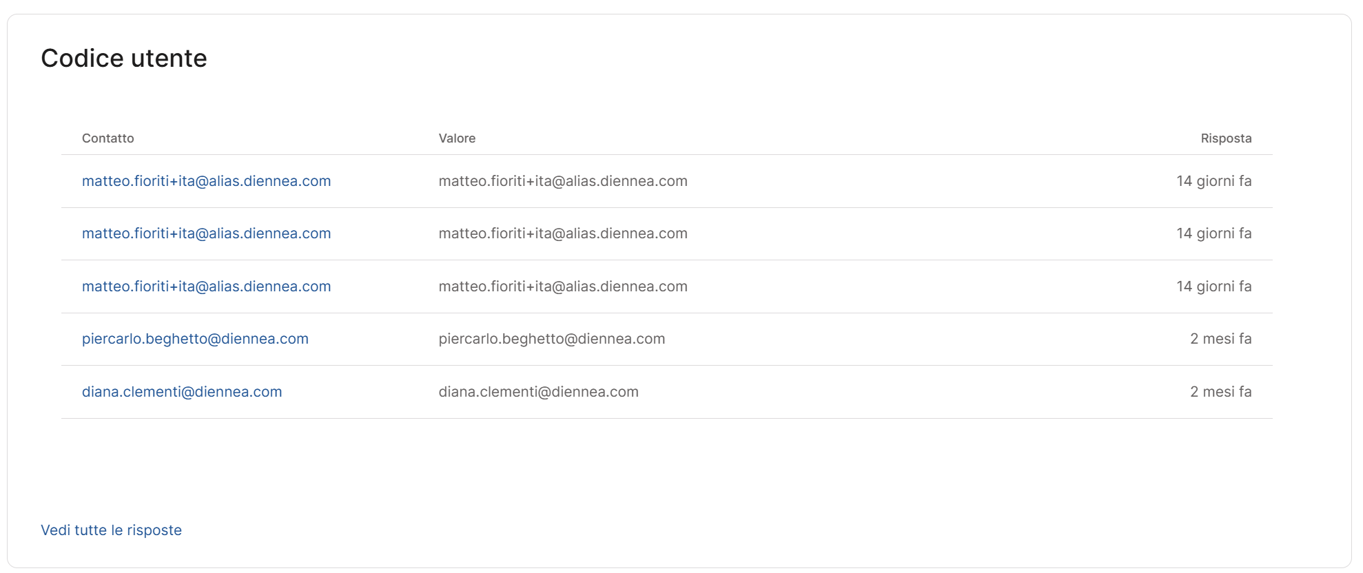 Il pulsante “Vedi tutte le risposte” ti permette inoltre di consultare l’elenco di tutte le risposte per avere una panoramica completa. In questo modo, anche quando i dati sono numerosi, non rischi di perderne nessuno e puoi approfondire ogni singola risposta con la massima precisione.