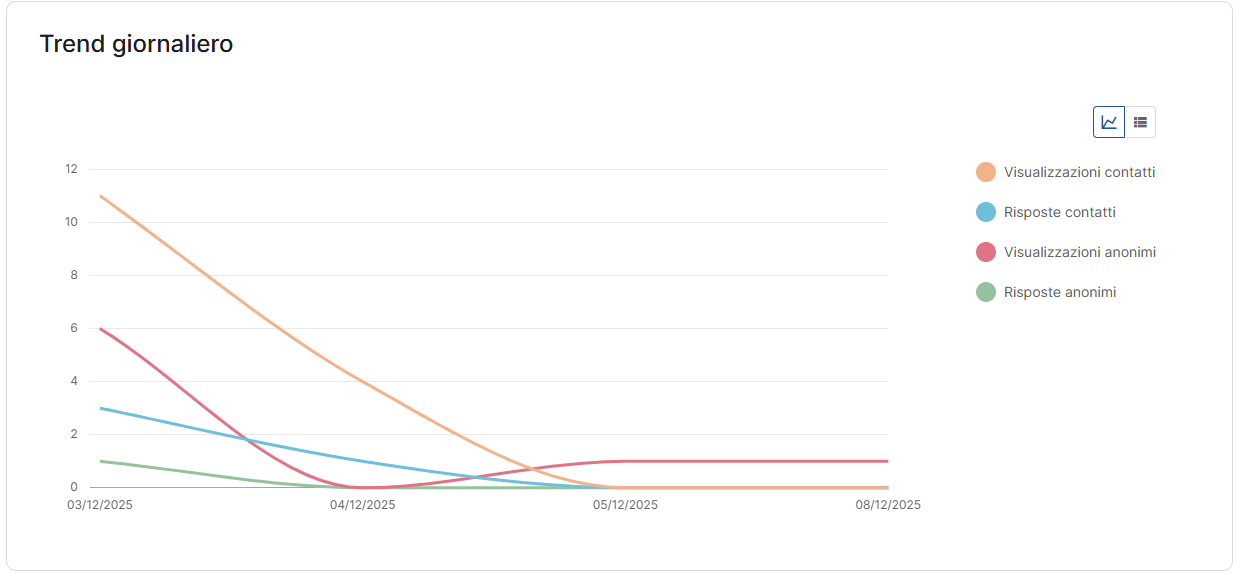 La sezione Trend ti aiuta a leggere l’andamento nel tempo di visualizzazioni e risposte in modo immediato, anche quando le risposte sono state archiviate.