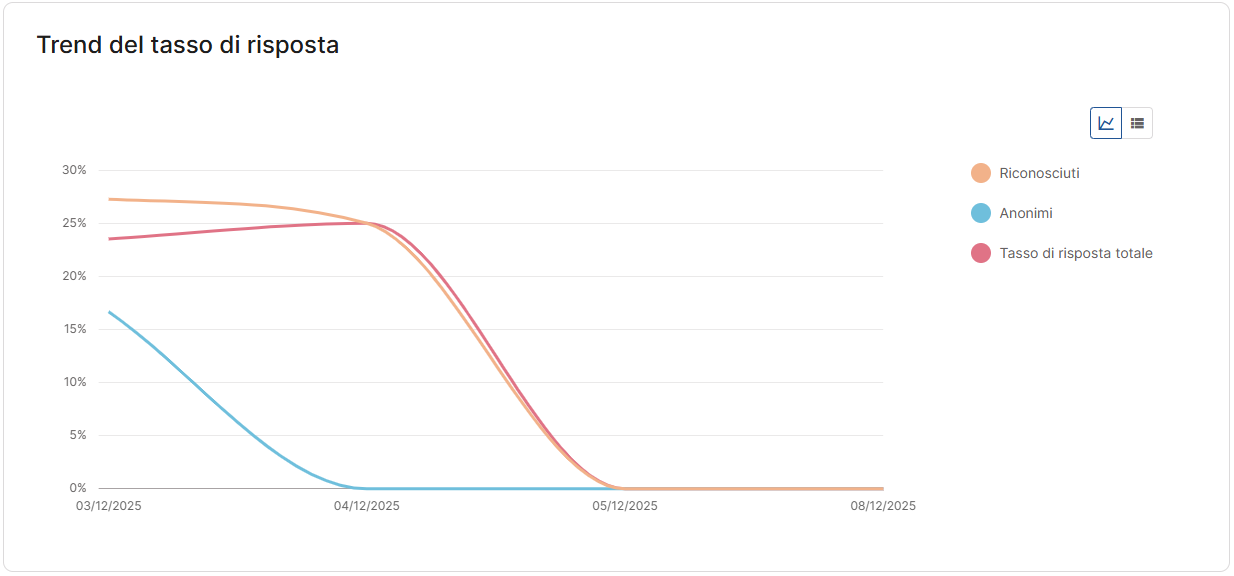 Se la landing page consuma crediti survey e ha registrato almeno una visualizzazione, trovi anche il grafico sul tasso di risposta giornaliero. Qui confronti il tasso di risposta dei contatti riconosciuti, degli anonimi e il valore complessivo, così capisci subito se chi visualizza la landing interagisce come ti aspetti o se conviene rivedere contenuti e impostazione. Anche questo grafico è disponibile in formato tabellare ed esportabile.