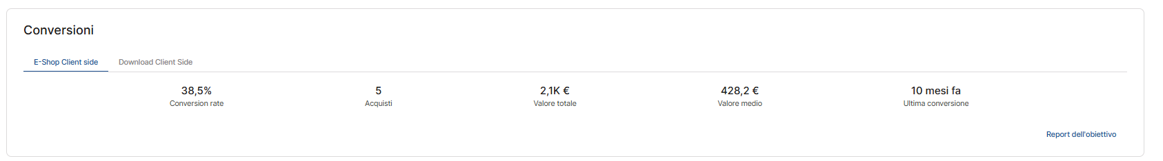 Cliccando su "Report dell’obiettivo" puoi accedere a un dettaglio ancora più completo relativo alle conversioni generate. Questa funzionalità ti consente di collegare l’efficacia del messaggio nel workflowc con i reali comportamenti degli utenti, per capire non solo chi ha cliccato, ma anche chi ha effettivamente concluso l’azione desiderata.