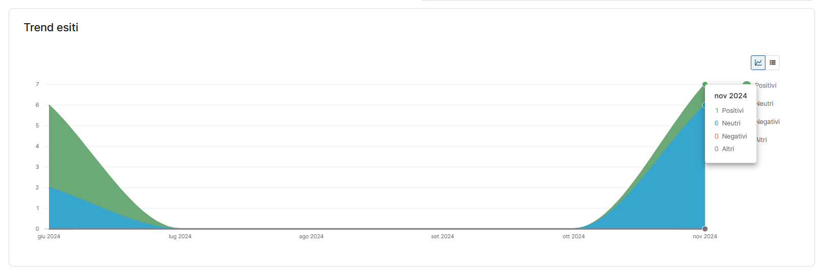 Questa sezione offre due modalità di visualizzazione., la prima è la vista Trend, rappresentata da un grafico che mostra l’andamento dei contatti suddivisi per esito: positivi, neutri, negativi o altri. È una rappresentazione immediata che ti consente di cogliere visivamente il peso di ciascun gruppo e l’evoluzione dei risultati lungo l’arco dei mesi.