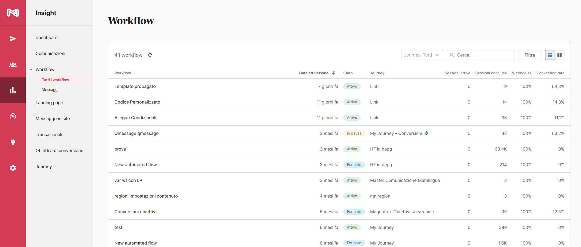 Nella sezione Tutti i workflow hai la lista completa di tutti i flussi configurati. Per ciascuno sono riportate informazioni utili come la data di attivazione, lo stato (attivo, in pausa o fermato), il journey di appartenenza, il numero di sessioni attive e concluse e il relativo tasso di conversione. Puoi filtrare e ordinare i workflow secondo diversi criteri, ad esempio per nome o per stato, e con un semplice click sul workflow che ti interessa puoi accedere al report completo e dettagliato.