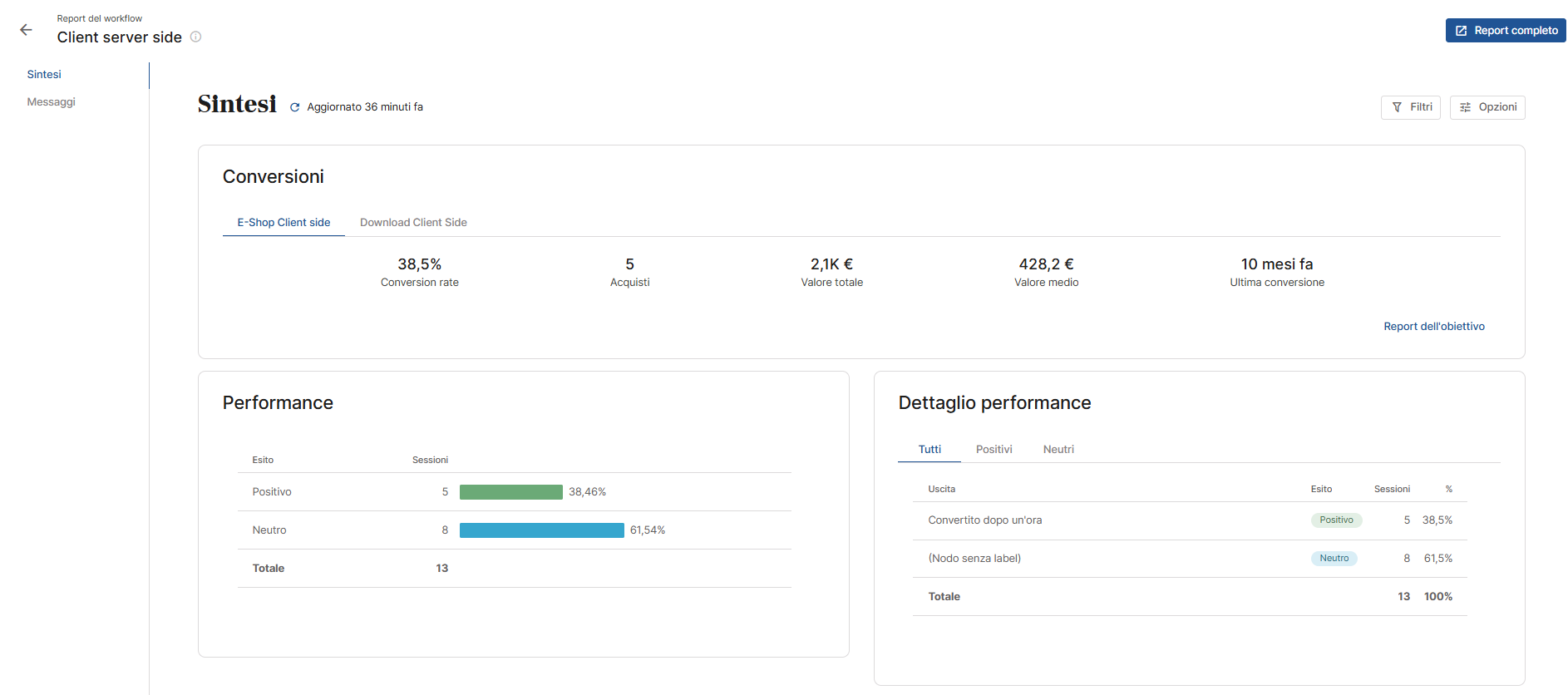Quando il messaggio nel workflow genera delle conversioni — come acquisti, download o iscrizioni — il primo report è quello relativo alle "Conversioni". Qui puoi vedere subito il tasso di conversione raggiunto dal workflow, quante azioni sono state completate (ad esempio acquisti o iscrizioni), il valore totale generato e il valore medio per conversione. Accanto a questi dati compare anche la data dell’ultima conversione registrata, così da capire da quanto tempo il flusso sta portando risultati. È un colpo d’occhio immediato per collegare l’efficacia dell’automazione ai risultati concreti di business.