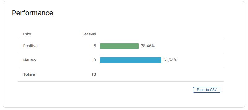 Il report "Performance", mostra come si sono distribuite le sessioni dei contatti che hanno attraversato il workflow. Gli esiti sono classificati in positivo o neutro e la rappresentazione visuale ti aiuta a leggere subito le proporzioni. È il modo più rapido per capire quanti contatti hanno completato con successo l’automazione e quanti invece si sono fermati senza concludere un’azione rilevante. Inoltre se vuoi lavorare sui dati in autonomia o integrarli in altre analisi, puoi esportare l’intera tabella in formato CSV con un semplice click.