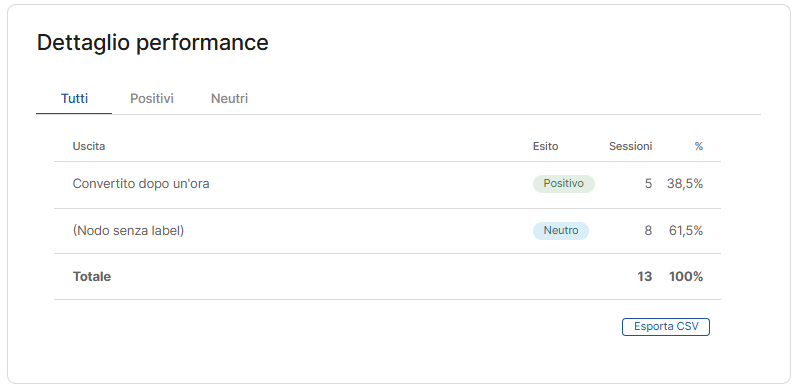 Il report "Dettaglio performance" aggiunge un livello in più di analisi. Qui puoi scoprire cosa si nasconde dietro a ciascun esito, osservando quali nodi del workflow hanno portato a una conversione, quali a un’uscita neutra o ad altri tipi di risultato. Puoi muoverti tra le diverse viste – tutti, positivi, neutri – e leggere sia la tabella numerica sia la rappresentazione grafica a ciambella, che mette in evidenza il peso di ciascun nodo. Questo dettaglio è molto utile per identificare i punti del flusso che funzionano meglio e quelli che hanno bisogno di essere ottimizzati. Inoltre, nella vista Tutti hai anche la possibilità di esportare i dati in formato CSV, così da poterli analizzare ulteriormente o integrarli in altre reportistiche.