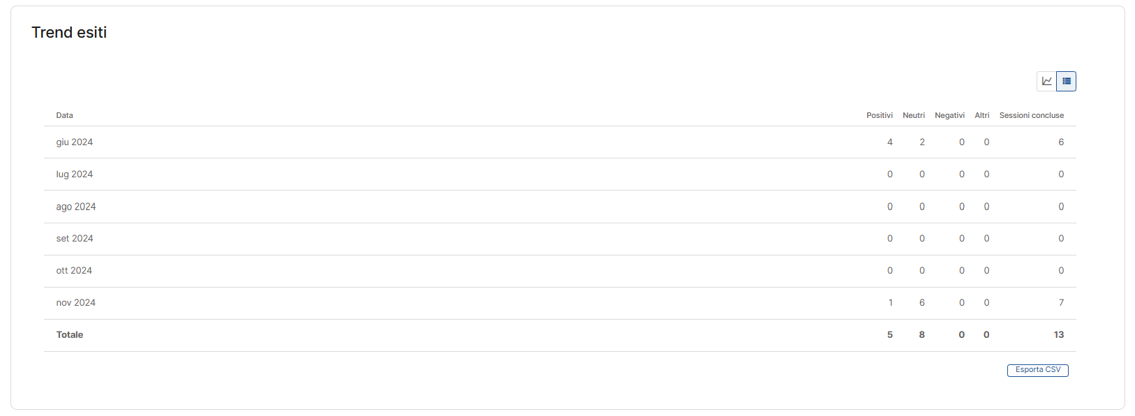 La seconda modalità è la vista Valori, che affianca al grafico una tabella dettagliata con i dati numerici per ogni mese. Qui puoi leggere con precisione quanti contatti hanno avuto esito positivo, quanti neutro, eventuali negativi e il totale delle sessioni concluse. Questa tabella può essere esportata in formato CSV, così da permetterti di lavorare sui dati in autonomia, integrarli in altre analisi o conservarli per un confronto storico.