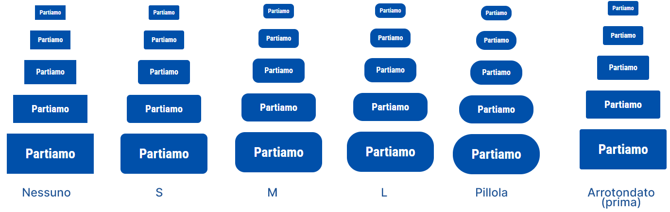 Aggiunte nuove dimensioni per il raggio degli angoli (S, M, L), scalate in base alla dimensione del pulsante. Sostituisce la scelta "squadrato", “arrotondato” o “pillola”; se si desidera il pulsante squadrato impostare Angoli = 0Di seguito una rappresentazione delle varie opzioni disponibili