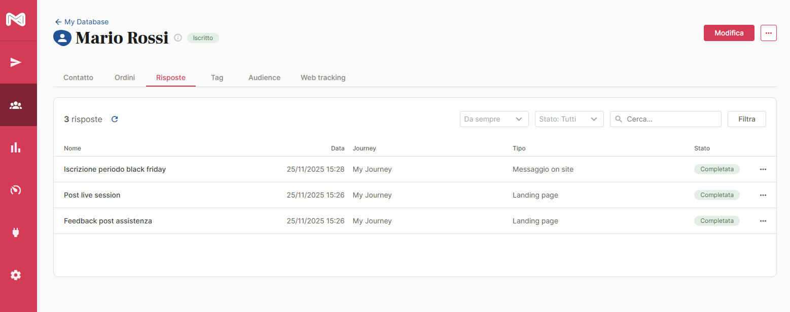Il tab Risposte raccoglie in un’unica tabella tutte le compilazioni associate al contatto. Qui trovi le risposte fornite tramite landing page e messaggi on site, sia complete sia parziali, con indicazione di data, stato e journey di origine.