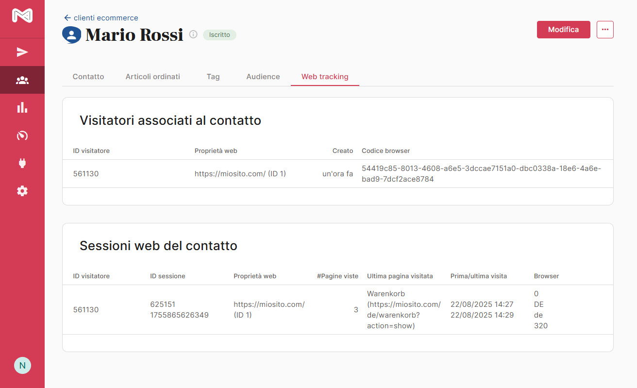 Il tab Web tracking mostra le visite e le sessioni web associate al contatto, registrate dopo l’interazione con le tue comunicazioni. Qui puoi vedere i visitatori collegati, le sessioni avviate sul sito tracciato, le pagine visitate e le informazioni sul browser utilizzato.