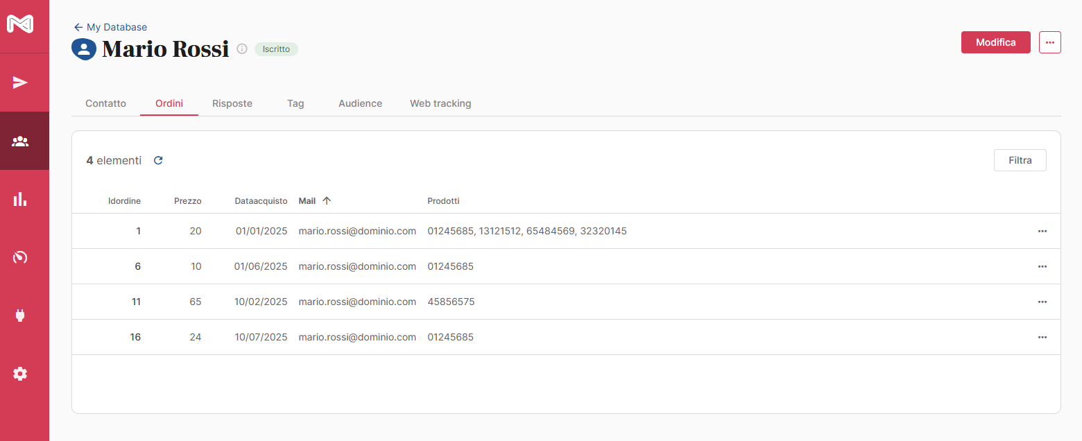 Ad esempio, se nel database è presente una tabella dati “Ordini”, nella scheda del contatto comparirà il tab Ordini, che mostrerà l’elenco di tutti gli ordini associati a quel contatto, con colonne come ID ordine, prezzo, data di acquisto, prodotti e altri campi rilevanti.