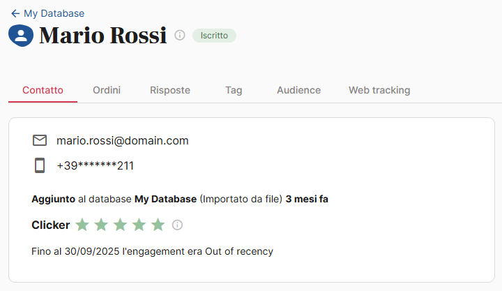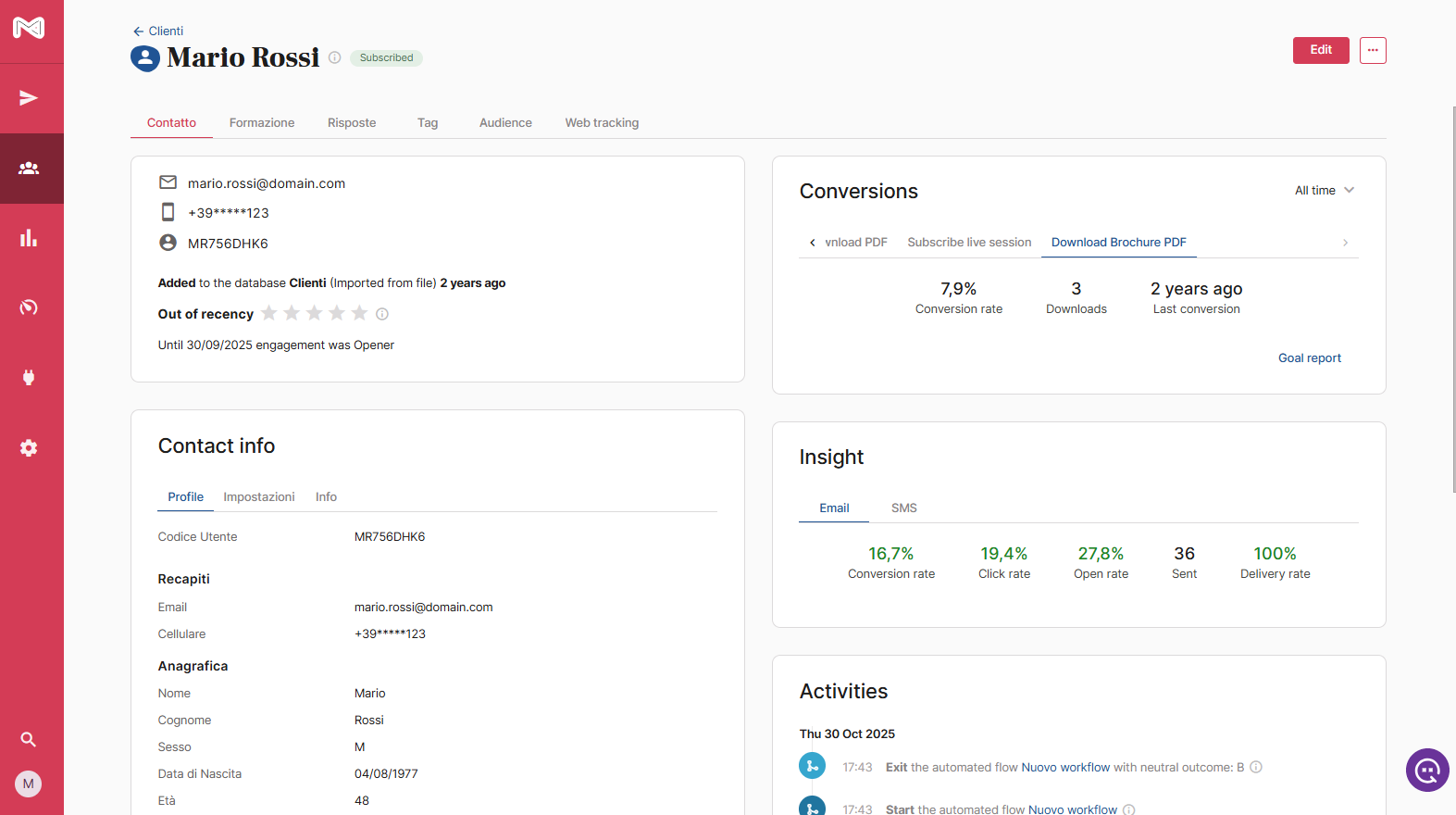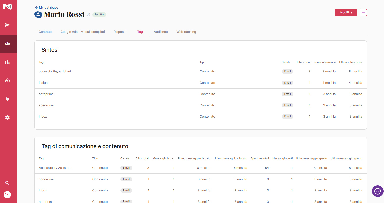 La scheda contatto è il punto in cui tutto ciò che riguarda un singolo utente converge: dati anagrafici, recapiti, attività, risposte, tabelle dati, tag, audience, web tracking e molto altro.